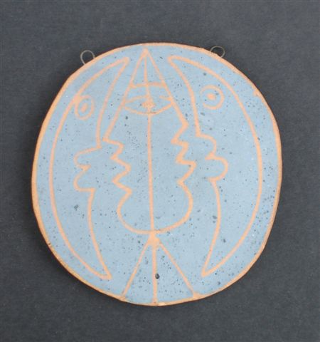 Jean COCTEAU (1889-1963). PENDENTIF OVALE "Astrologie" en terre cuite. Décor au crayon d'oxyde bleu, au pochoir, en réserve de deux croissants de lune, face à face, enserrant un profil double. D'après un dessin de Cocteau de 1958. Deux petits anneaux de suspension latéraux, en métal, pris dans la terre.