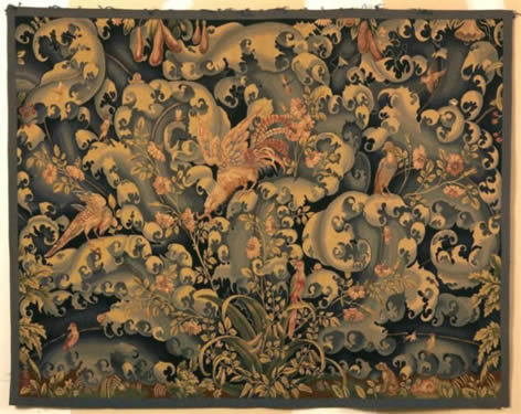 Verdure de larges feuilles découpées et branches fleuries aux oiseaux, insectes et petits mammifères.