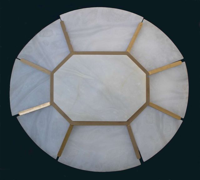 Important lustre en albâtre et bronze argenté de forme corolle. Le bronze argenté a été peint en doré.