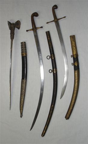 Poignée à plaquettes de corne. Monture en vermeil. Garde à deux quillons droits, boulés, à pans aux extrémités et deux oreillons. Lame courbe en damas, à contre tranchant. Fourreau recouvert de cuir à couture métallique, à deux garnitures et deux bracelets en vermeil décoré d'écailles de poissons.