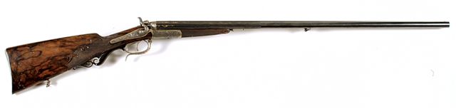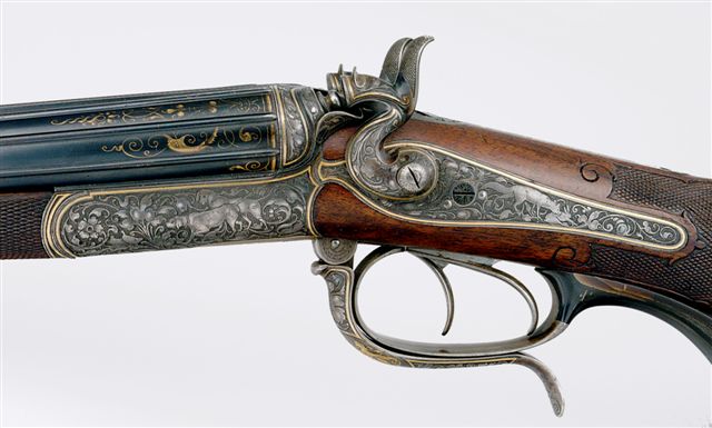 BEAU FUSIL DE CHASSE à percussion centrale, chiens extérieurs, deux coups, calibre 20-70 extracteur. Canons ronds, bleuis, juxtaposés de 80,5 cm, marqué sur la bande « Dieter Hofbuchsenmacher München », décoré à l'or au tonnerre d'incrustation et de rinceaux feuillagés. Platines arrières, chiens, bascule et pontet bordé d'un filet d'or, finement ciselés, à décor de chiens de chasse, renards, lapins, lièvres, biches et rinceaux feuillagés. Double détente. Ouverture par clef sous pontet, ciselé en suite et incrusté aux Grandes Armes en or de la Maison du royaume de Bavière. Queue de pontet en corne, mouvementé. Crosse à joue en noyer joliment sculpté de Saint Hubert, en partie quadrillé ainsi que le devant sculpté de feuillages sur l'extrémité. Plaque de couche à décor quadrillé, jaspé.