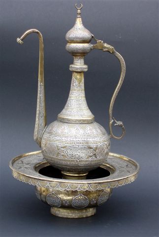 AIGUIERE ET SON BASSIN en laiton à décor ciselé et incrusté d'argent et rehauts de cuivre rouge. Aiguière à panse bulbeuse, long col, anse zoomorphe et couvercle surmonté d'un croissant. Décor en registres de cartouches inscrits, d'arabesques et de rubans entrelacés. Bassin à bord festonné, orné de cartouches polylobés calligraphiés.