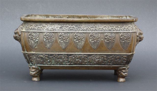 JARDINIÈRE en bronze à patine brune à décor ciselé de médaillons de dragons stylisés.