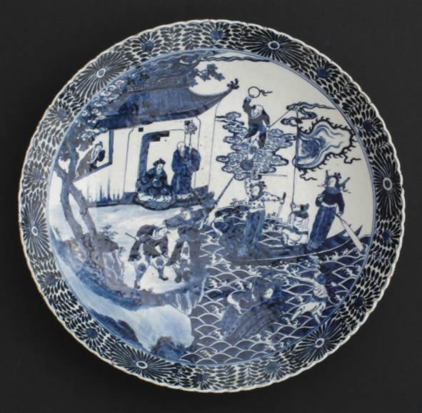 COUPE de forme lobée en porcelaine blanche décorée en bleu sous couverte de personnages et divinités. Au revers de la base la marque apocryphe de Kangxi.