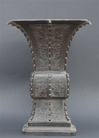 VASE de forme "GU" en bronze à patine brune à décor de masques et de Tao Tié.