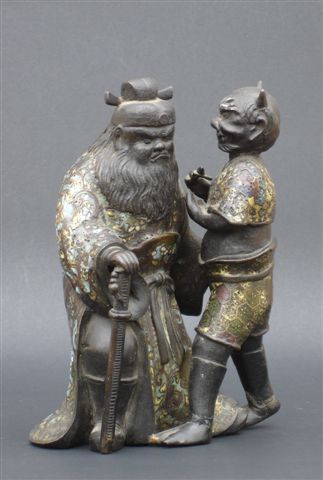 GROUPE en bronze à patine brune et émaux cloisonnés, représentant Shoki et Oni. Au revers de la base la marque apocryphe de Xuande.
