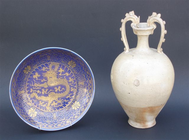 COUPE de forme ronde en porcelaine émaillée bleu décorée en émail or d'un dragon, caractère " shu " et fleurs. Au revers de la base la marque Guangxu en rouge de fer.