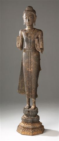 Statue de BOUDDHA debout en bronze à patine brune, les...