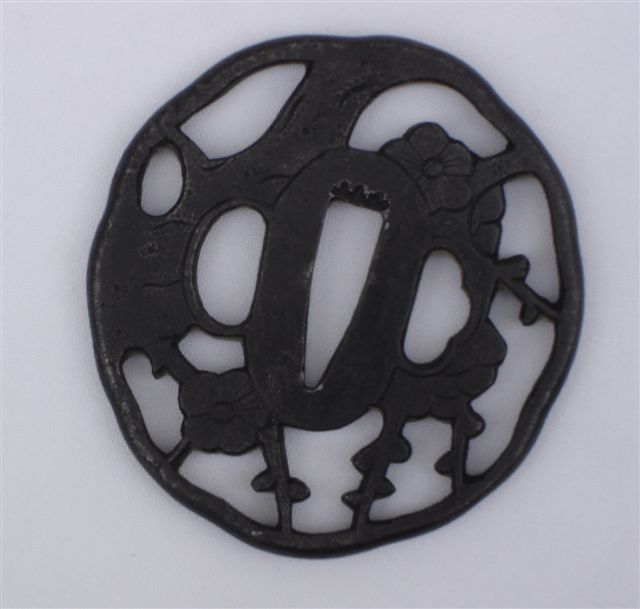 MOKKO-GATA ondulée en fer, gravée et décorée en sukashi-bori de fleurs de cerisiers.