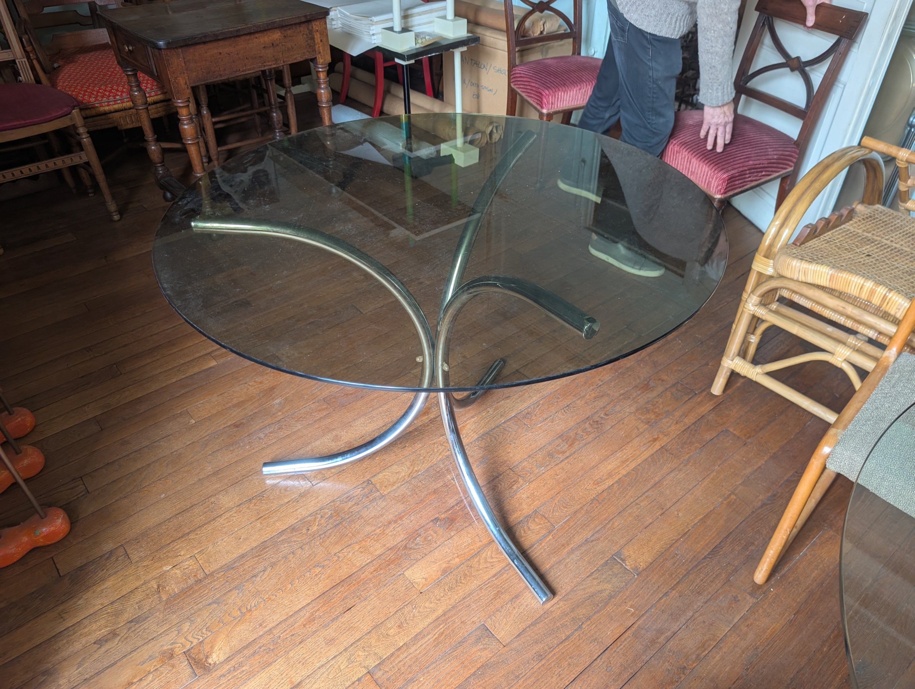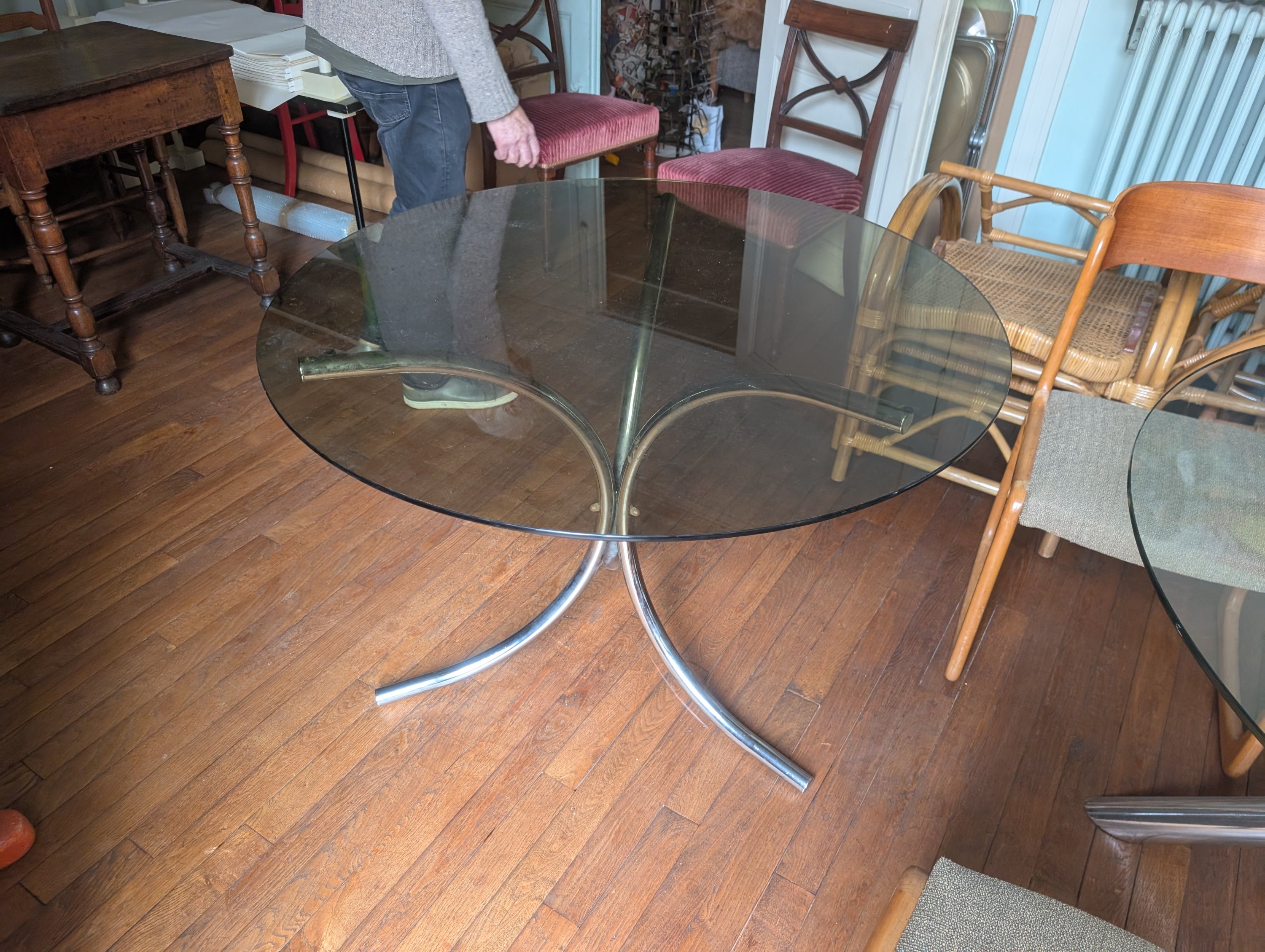 Piétement tripode en métal, nickelée, le plateau de forme circulaire en verre fumé.