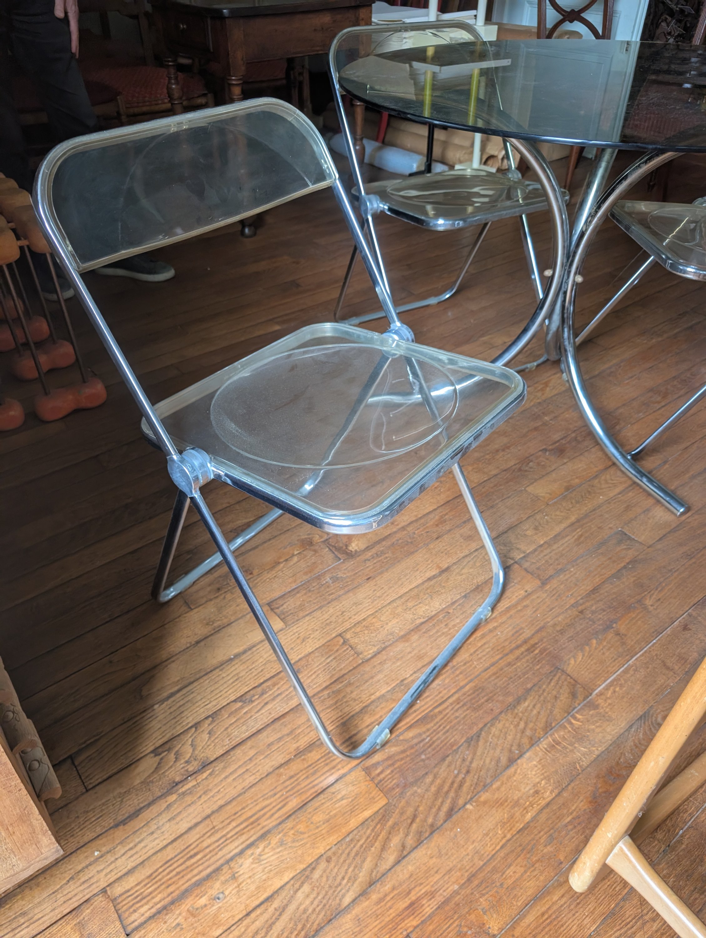 Joint: trois chaises pliantes par Giancarlo Piretti (Italien, 1940) pour Castelli chromées et plexiglas.