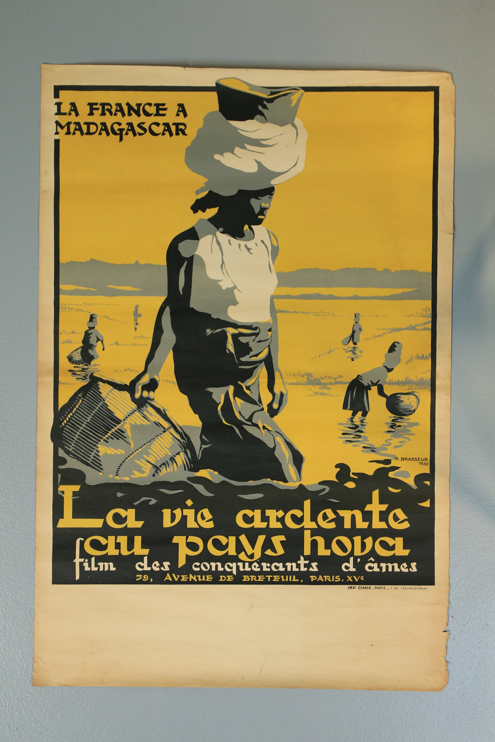 - P. Brasseur, La France à Madagascar. La vie ardente au pays Hova, film des conquérants d'âmes. 1930. 79, avenue de Breteuil, Paris (XVe). Affiche en couleurs, Impr. Chaix, Paris. 119 x 80 cm. Non entoilée (petites déchirures en marge).