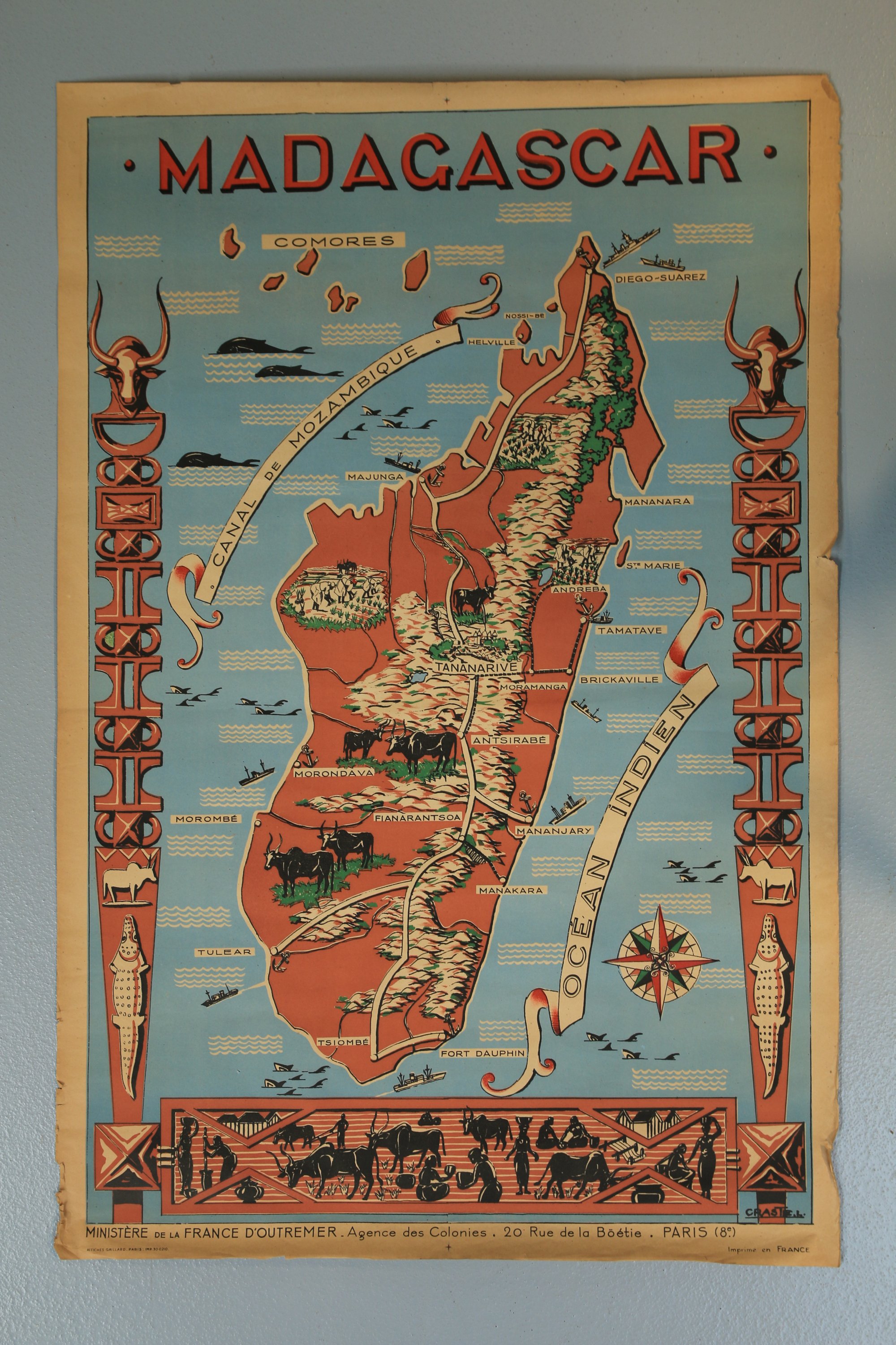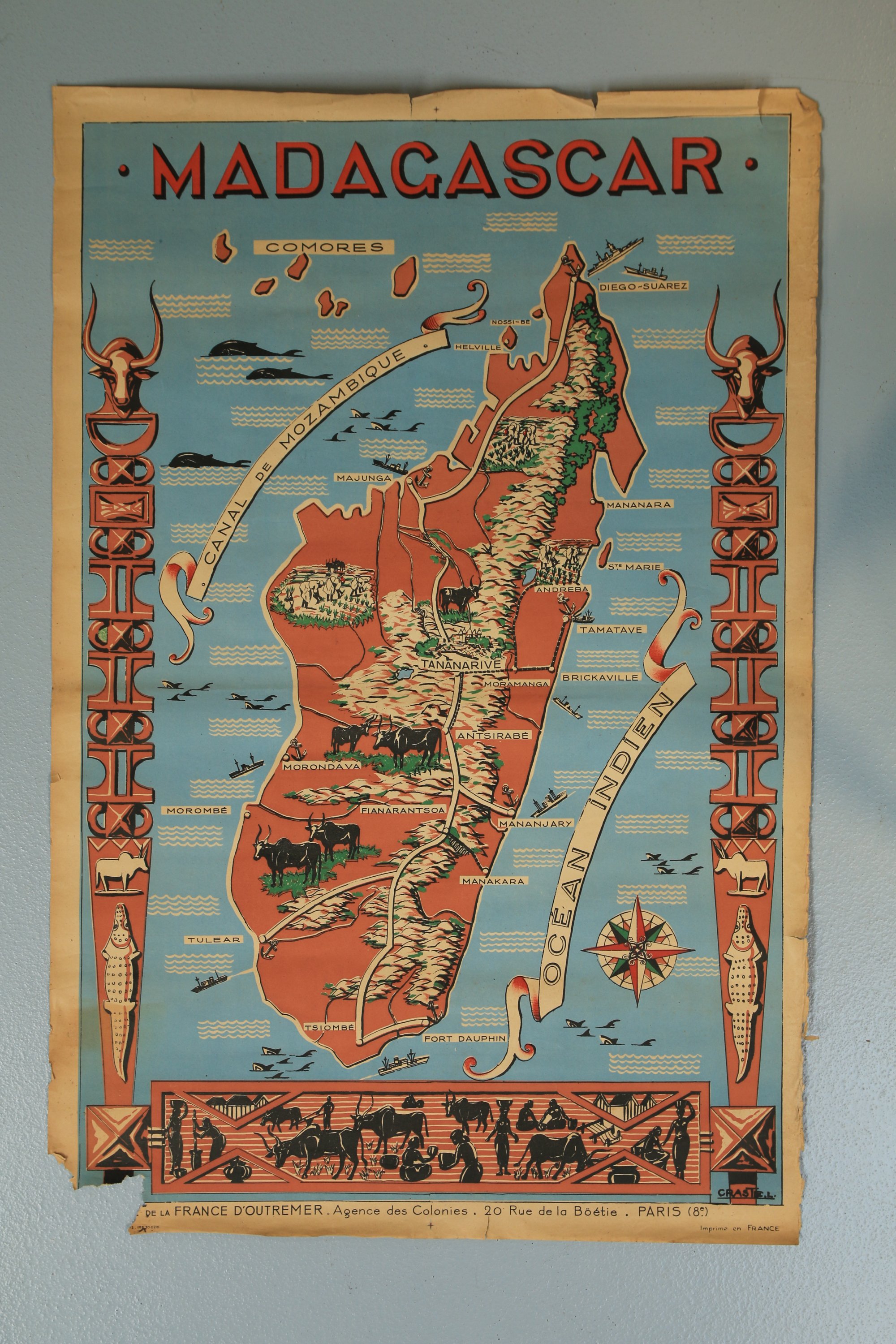 Ill. de vignettes figurant des zébus, emblème du pays, et des paysans aux champs. De chaque côté figurent des totems malgaches à tête de zébu. Les mers sont illustrées de cétacés, de bateaux et d'une rose des vents. Les villes les plus importantes sont nommées. Aquarelliste, ancien élève de l'Ecole des Beaux-Arts, architecte D.P.L.G. (diplômé par le gouvernement) et urbaniste diplômé de l'Université de Paris, Léo Craste (1887-1967) a fait la plus grande partie de sa carrière en Indochine, où il fut nommé architecte principal des bâtiments civils. A la fin des années 30, de retour d'Indochine, il partit pour l'Afrique, et visita le Sénégal, la Guinée et le Soudan. Il a rapporté de ses voyages en Asie et en Afrique de nombreuses aquarelles. Il a également dessiné le projet du monument aux morts d'Elbeuf en Seine-Maritime (1920), réalisé en collaboration avec le sculpteur Albert Guilloux. En janvier 1946, le ministère des Colonies, créé en 1894, fut renommé ministère de l’Outre-mer.