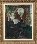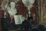 The woman in this 1887 painting is seen from the back, playing the piano in a bourgeois living room where a marble bust and a medallion portrait stand side by side. The model's inner calm seems to be reflected in her surrounding environment, as is the case with other paintings from the artist’s limited corpus of work. Karl Jensen-Hjell died of tuberculosis the following year, at the age of 25.