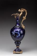 AIGUIÈRE, en forme de BUIRE renversée dite DIETERLE, en cuivre émaillé figurant les allégories du JOUR et de la NUIT en camaïeu bleu s'épanouissant sur l'ensemble de la panse du vase, avec des rehauts de blanc et d'or. Riche ornementation de guirlandes ornées de fleurs de lotus, de feuilles de chêne et de vigne, d'une couronne de cœurs enrubannée ainsi que de motifs en enroulement néo-renaissance. L'intérieur du bec étoilé d'or sur un fond d'émail blanc.