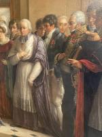 Notre lustre aux joueurs de cymbales rappelle un modèle comparable livré au Garde-Meuble pour le salon rouge de l'appartement du prince Napoléon au Palais-Royal, selon le mémoire du 25 mai 1853 : « un lustre à 32 lumières à 4 enfants tromp en bronze ciselé, doré, garni de cristaux ». (Mobilier National, inv. GML-3914-000). Le même inventaire nous apprend quun lustre aux musiciens, très probablement semblable à celui-ci, fut acquis auprès de la maison Marquis en 1853 pour la galerie Louis XVI de l'appartement du prince Jérôme Napoléon au Palais-Royal. L'inventaire de cette demeure dressé en 1856 n'indique pas de sortie pour ce lustre.