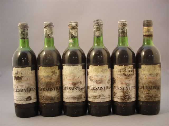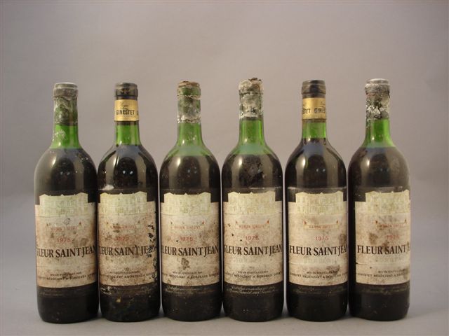 FLEUR SAINT-JEAN. Ginestet négociant à Bordeaux, 1975. 18 bouteilles (3 légèrement basses, 5 moyennement basses, 8 basses, et 2 basses / vidange). Capsules abîmées et étiquettes sales.