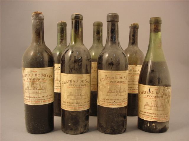 - 7 bouteilles de CHÂTEAU DE SALES, Pomerol, 1959 (1 moyennement basse, 5 basses, 1 vidange). NB : une bouteille n'as pas la forme habituelle des bouteilles bordelaises (?).