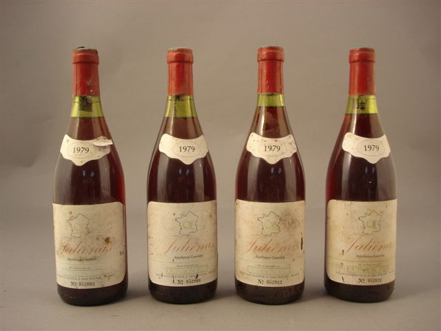 JULIÉNAS. Quinson Fils, 1979. 4 bouteilles. 1 étiquette légèrement abîmée.