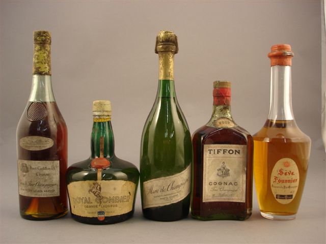 Ensemble de 5 bouteilles de VIEUX COGNAC ET ALCOOLS :