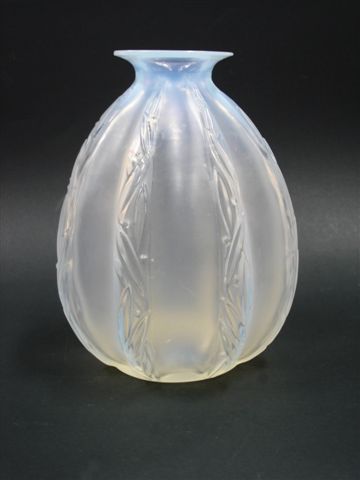 VASE ovoïde en verre moulé opalescent à côtes creuses alternées de frises de feuillage lancéolé. Signé à la molette.