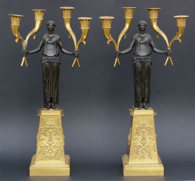 PAIRE de CANDÉLABRES en bronze doré et patiné. Cariatide drapée à l'Antique retenant deux paires de bras de lumière. Socle pyramidal tronqué orné en applications de têtes de faune et chimères, sur une base à godrons.