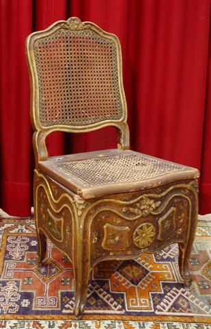 CHAISE DE COMMODITÉ galbée en façade, en bois mouluré verni or. Décor sculpté de rosaces et fleurettes, peint de fleurettes et latéralement de deux scènes illustrant les Fables de Jean de La Fontaine : sur l'une, Le Lièvre et la Tortue, sur l'autre, Le Renard et le Corbeau. Pieds cambrés. Foncée de canne (accdt à l'assise).