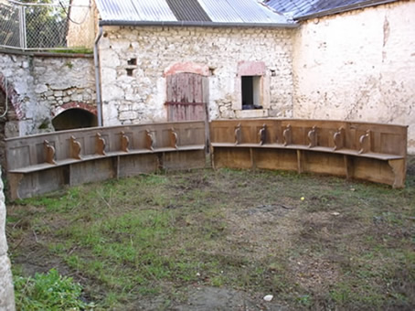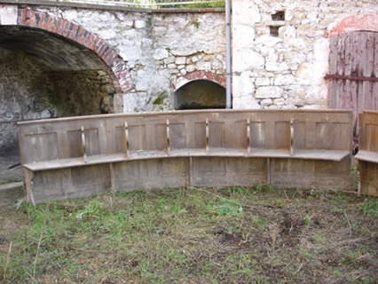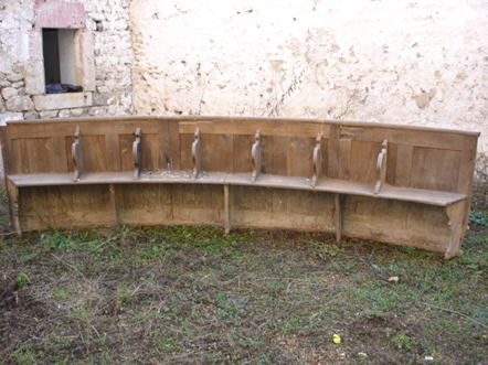 Paire de BANCS en chêne, dit de choeur, 7 places (x2) en boiserie de forme arquée en 1/4 de rond.