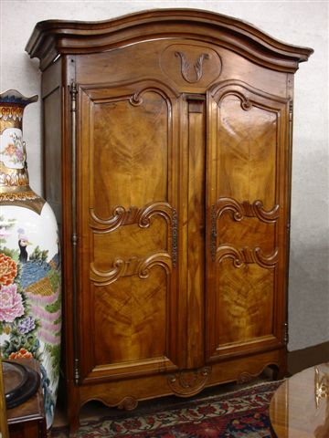 ARMOIRE en noyer à corniche cintrée et pieds cambrés. Montants cannelés. Vantaux sculptés de volutes. Fronton sculpté d'un motif en forme de lyre feuillagée en son centre.