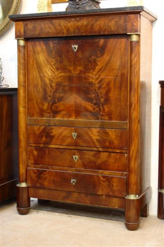 SECRÉTAIRE en placage d'acajou à colonnes engagées. Il présente trois tiroirs dans sa partie inférieure et un tiroir dans sa partie haute. L'abattant découvre six tiroirs et un casier central à deux colonnes engagées. Dessus en marbre gris foncé.