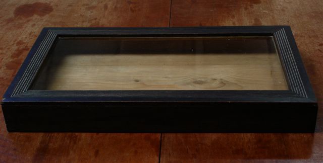 VITRINE plate en bois noirci. Dessus vitré coulissant, mouluré de filets. Anneau de suspension. XIXème.