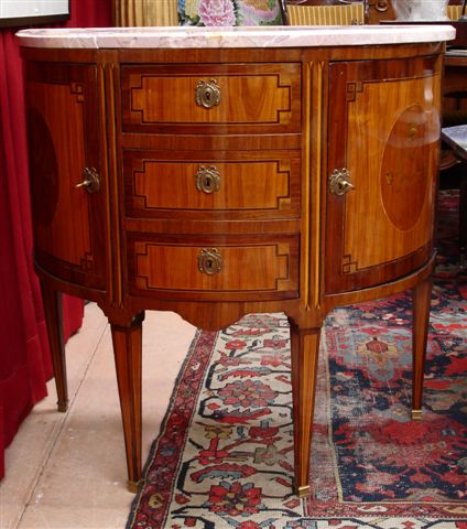 Petite COMMODE demi-lune en bois de placage ouvrant à trois tiroirs et deux vantaux. Marqueterie de bouquets de fleurs dans des médaillons. Pieds en gaine. Ornementation de bronze : entrée de serrure et sabots. Dessus de marbre rose (accident).