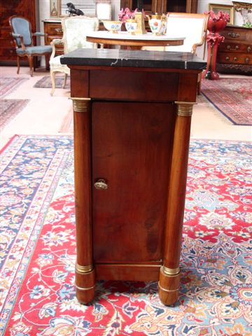 CHEVET en bois fruitier ouvrant à un rideau et un vantail, à colonnes détachées baguées de bronze. Dessus de marbre gris.
