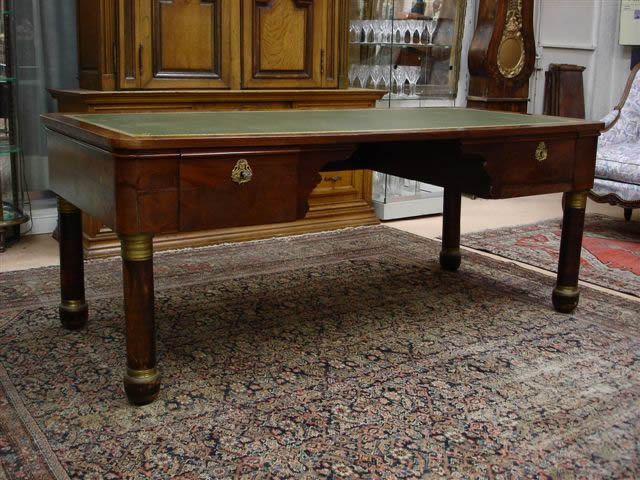 Grand BUREAU PLAT en placage d'acajou, ouvrant à deux tiroirs latéraux, reposant sur quatre colonnes. Ornementation de bronzes : bagues et entrées de serrure aux cygnes. Dessus de cuir vert doré aux fers.