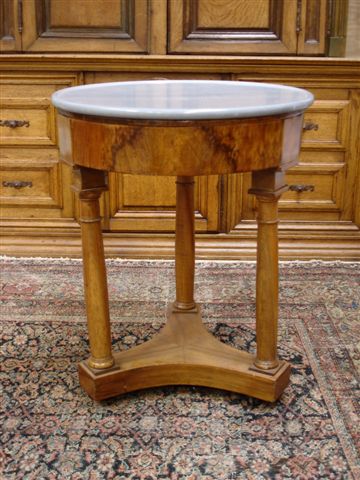 GUÉRIDON en bois de placage. Piètement constitué de trois colonnes renflées réunies par une entrejambe. Roulettes.