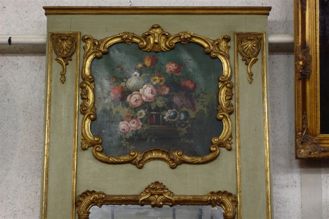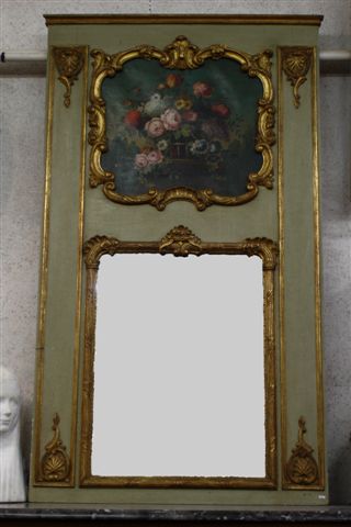 TRUMEAU en bois sculpté laqué vert et doré. Le miroir est encadré de godrons feuillagés et fleuris. Il est surmonté d'une huile sur toile représentant une corbeille de fleurs dans un encadrement à volutes, dans le goût du XVIIIème. Encadrements latéraux verticaux ornés de coquillles.