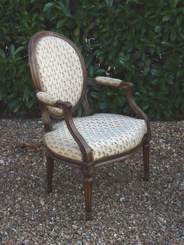 FAUTEUIL cabriolet en bois naturel à dossier médaillon. Pieds fuselés et cannelés. Consoles d'accotoirs à cannelures rudentées.