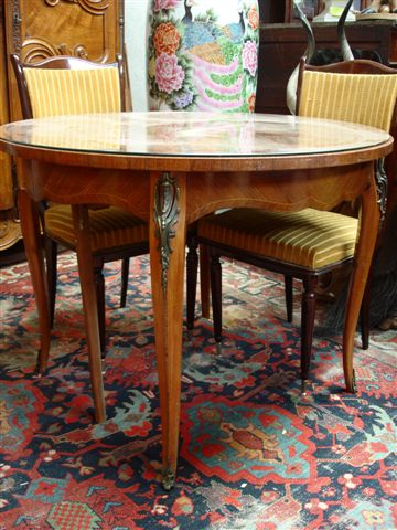 TABLE ronde à allonges en bois de placage. Plateau à décor marqueté de fleurs dans un encadrement chantourné. Ceinture mouvementée. Repose sur des pieds cambrés. Ornementations de bronze : chutes et sabots.
