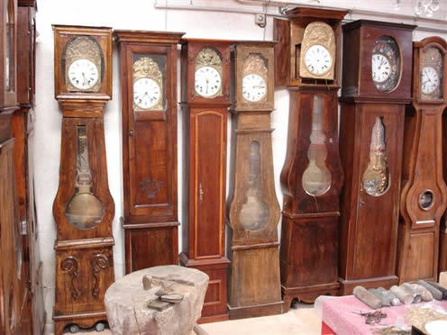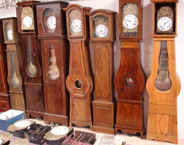 HORLOGE COMTOISE. Cadran en émail marqué MICHEL à Glos La Ferrière, entourage en laiton à décor repoussé d'un couple de faucheurs (dans l'état).