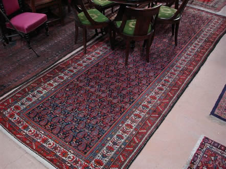 Importante GALERIE d'Orient, YORAVAN, Iran, à décor de boteh, encadrements de fleurs, à dominante rouge et bordeaux. 400 x 155 cm.
