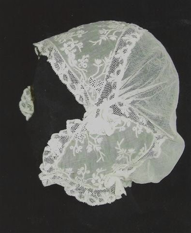 Coiffe dite "de MATINÉE" en tulle brodé. Les macarons sont tenus par un fil métallique dont la formule a été perdue au fil du temps. Coiffe portée par les dames de la bourgeoisie avant de se faire coiffer par leur femme de chambre ou camériste.