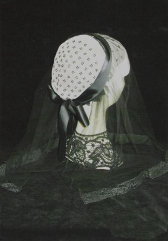 Coiffe de GRAND-DEUIL d'une bourgeoise tourangelle. Fond brodé de plumetis noir, ruban moiré, voile de tulle noir bordé de crêpe travaillé. Indre et Loire.