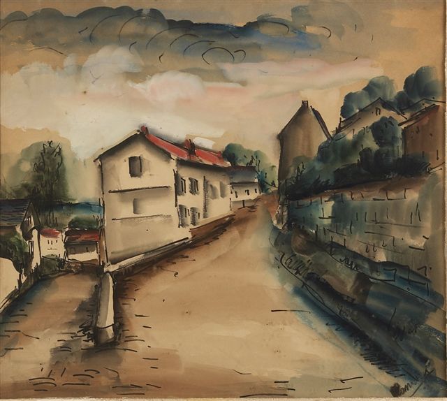 Rue de village. Gouache sur papier marouflée sur carton, signée en bas à droite.