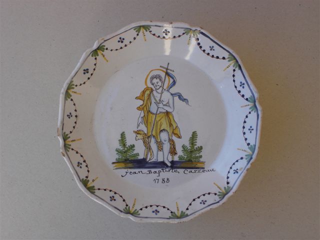 AUXERROIS - ASSIETTE patronymique en faïence de grand feu au nom de "Jean Baptiste Carreau 1788". Décor polychrome représentant Saint Jean et son agneau. Aile chantournée ornée de guirlandes en bordure.