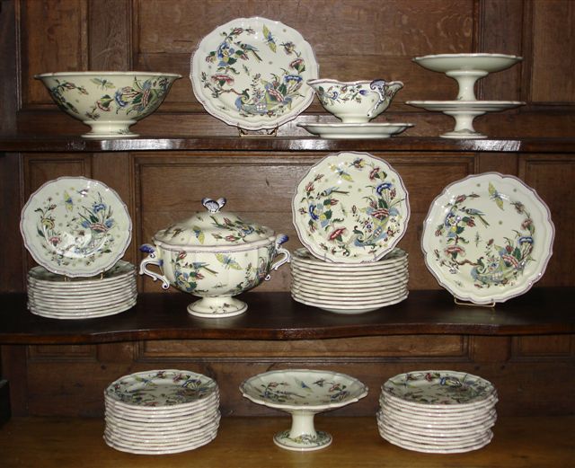 GIEN - SERVICE de TABLE à décor Rocaille dit à la corne d'abondance d'après un modèle de Rouen vers 1775-1780. 56 pièces : 24 assiettes plates, 12 assiettes à dessert, 12 assiettes creuses, 1 soupière couverte, 1 saladier, 2 plats rond, 3 coupes à fruit, 1 saucière. (accdt. au saladier).