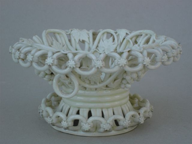 LANGEAIS - CORBEILLE ajourée en faïence fine à anses mobiles à décor de pampres de vigne. Marque en creux de CH. de BOISSIMONT et Cie à LANGEAIS (INDRE ET LOIRE).