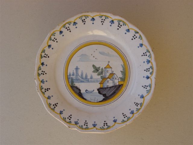 LA ROCHELLE - ASSIETTE en faïence de grand feu. Décor polychrome circulaire d'un paysage à la barque et au pont dans le bassin. Aile chantournée à frise stylisée en arcs.