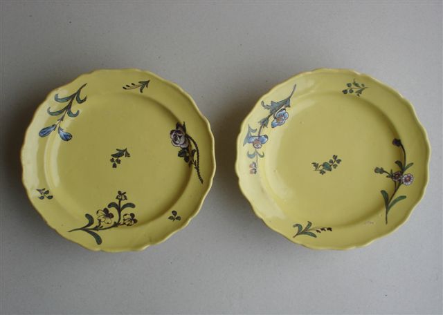 MARSEILLE - JOSEPH II FAUCHIER (?). Paire d'ASSIETTES en faïence de grand feu. Décor de branches fleuries au naturel sur émail jaune.