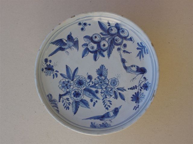 NEVERS (?) - ASSIETTE en faïence de grand feu à décor en camaïeu bleu de trois oiseaux parmi des branches chargées de fruits et de fleurs, sur émail bleuté.