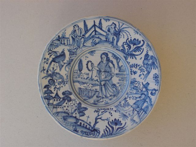 NEVERS - ASSIETTE en faïence à décor italo-nivernais en camaïeu bleu d'une scène allégorique au centre, et de personnages, oiseaux, architecture et fleurs sur l'aile, dans le goût des Conrade.